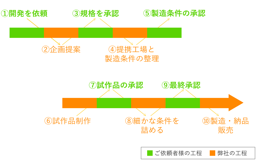 当社は自社工場を持たない“ファブレス”のスタイルをとっており、商品ごとに最適な協力工場と連携することで、ジャンルに捉われない商品開発が可能となります。